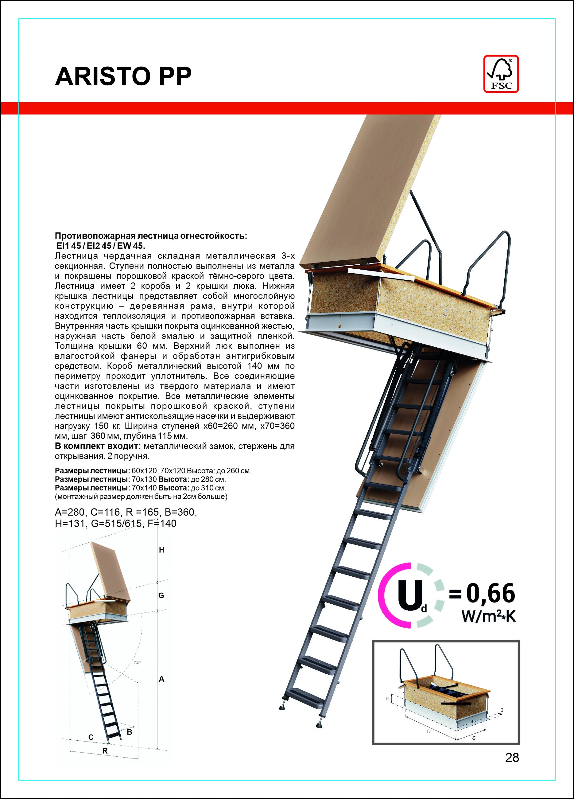 Модель лестницы MAXI EI45 идеально подходит для установки в помещениях подверженных возгоранию, её противопожарные свойства позволят эффективно изолировать помещение, в котором возник пожар, от чердака, тем самым предотвращая дальнейшее распространение огня. Лестница имеет в комплекте нескользящие насадки на ножки, которые идеально прилегают к полу, предотвращают появление царапин и придают лестнице эстетичный вид после ее резки (подгонки по высоте).