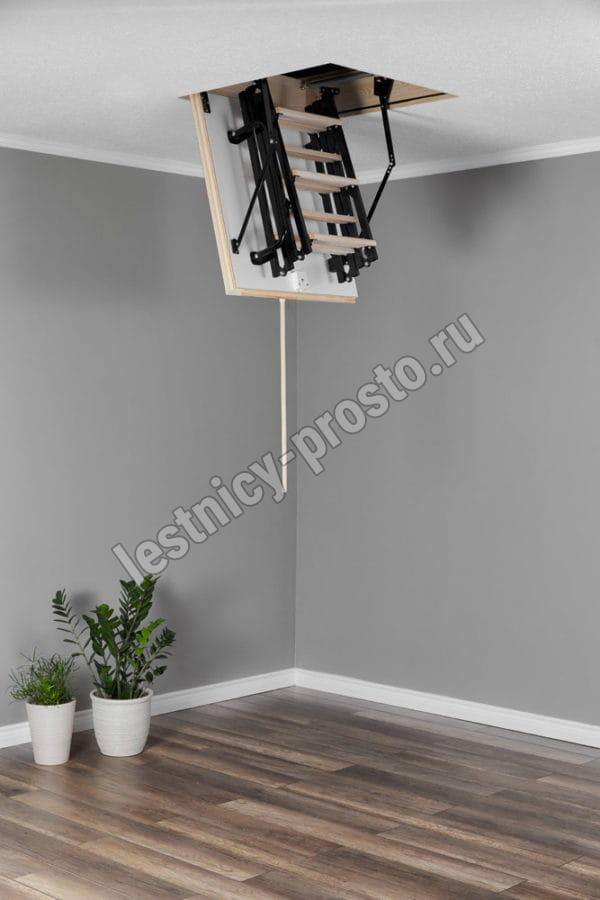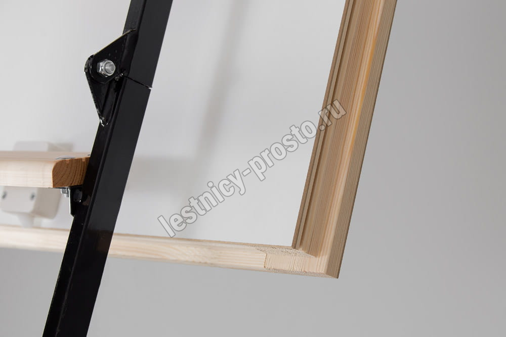 Складная 4-х секционная чердачная лестница. Ступени выполнены из сосны, имеют противоскользящие насечки, направляющие из металла