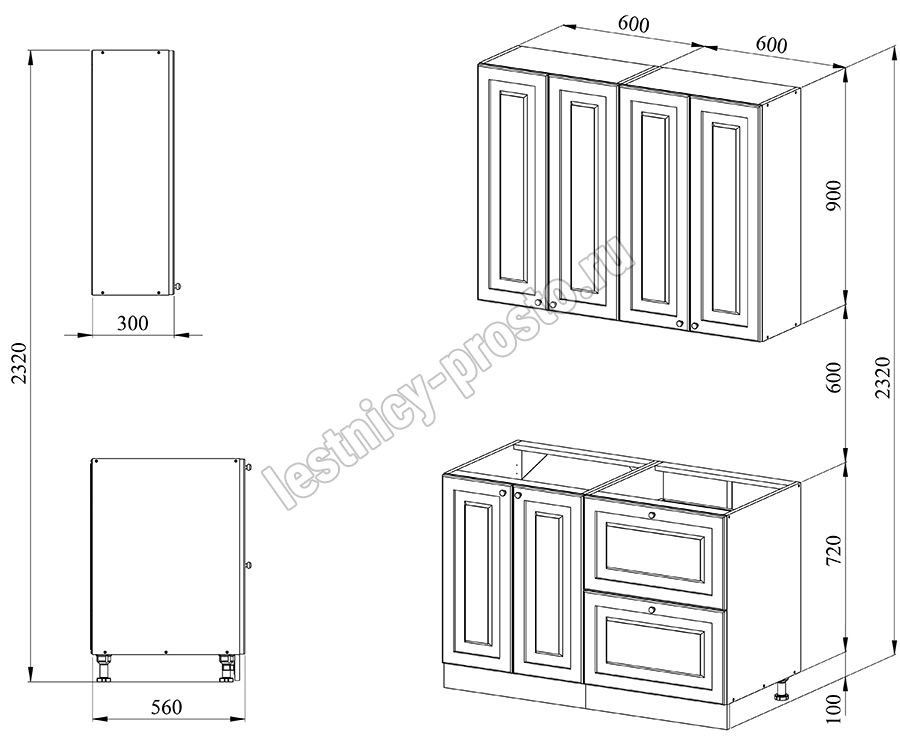 Благодаря модульной системе такая кухня может быть собрана зеркально, а, например, верхние шкафчики "под стекло" и "глухие" заменены местами. В стандартной комплектации нижние тумбы оснащены регулируемыми ножками высотой 100 мм и цоколем из массива сосны высотой 95 мм.