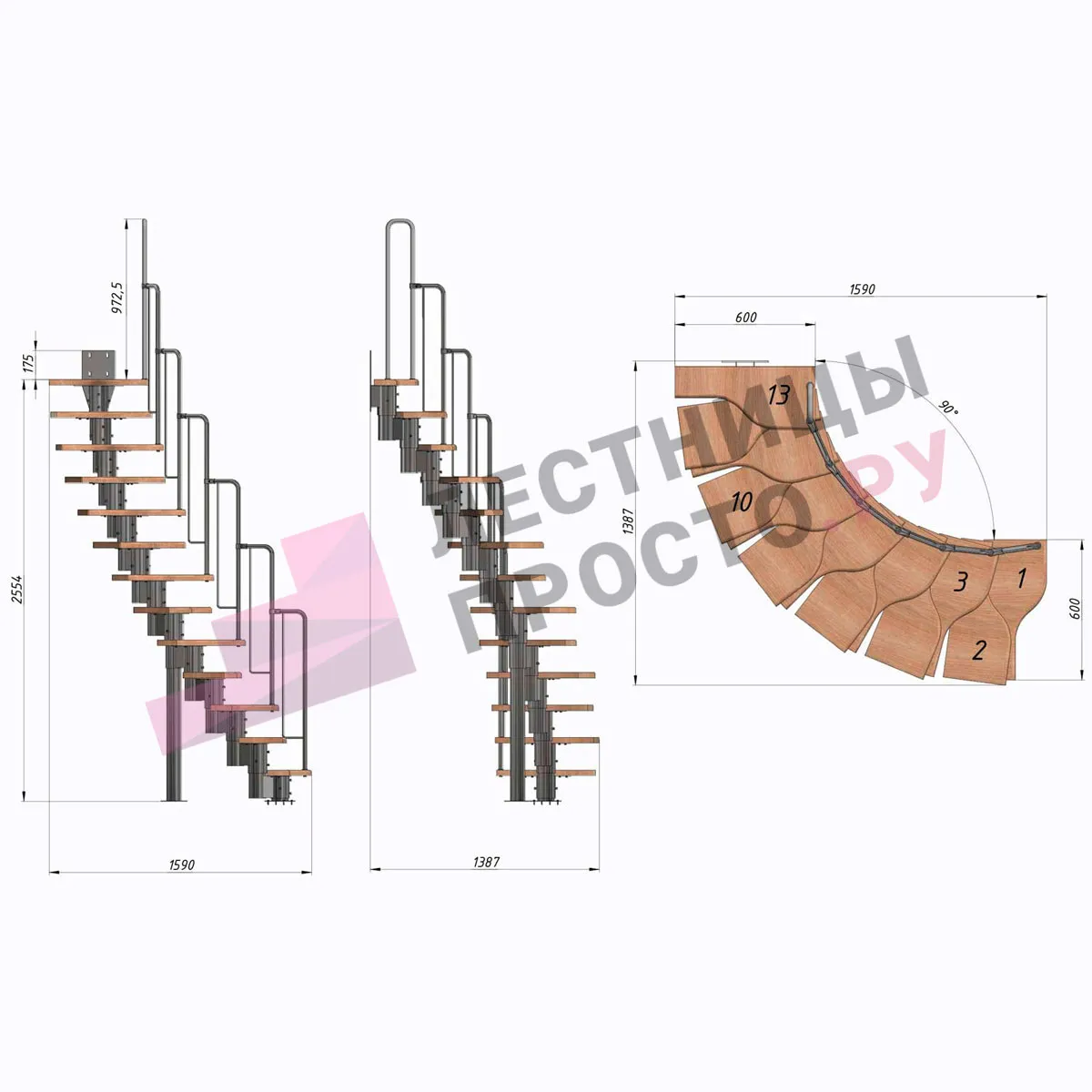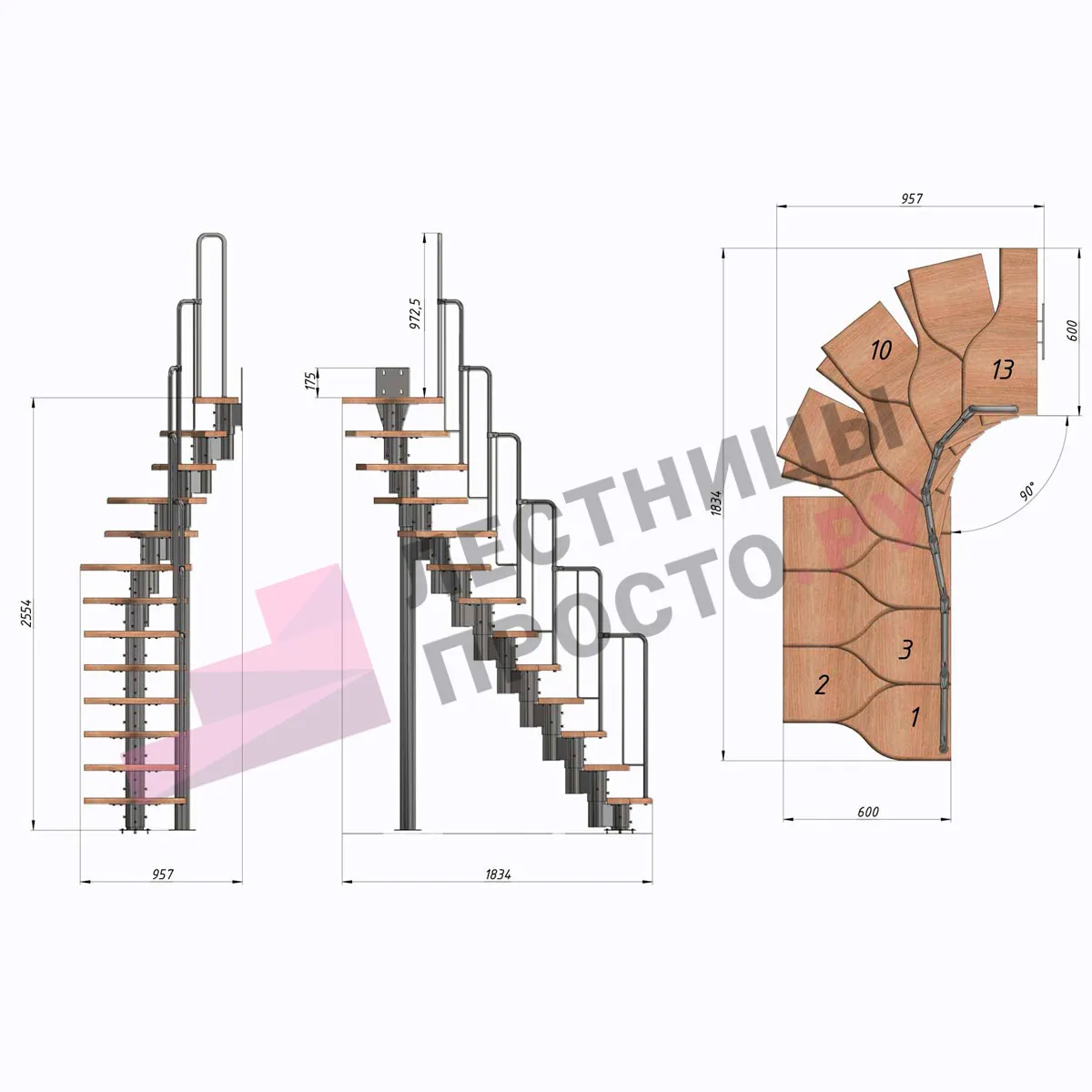 Лестница Prosto Urban Grey г-образная гусиный шаг 600 мм