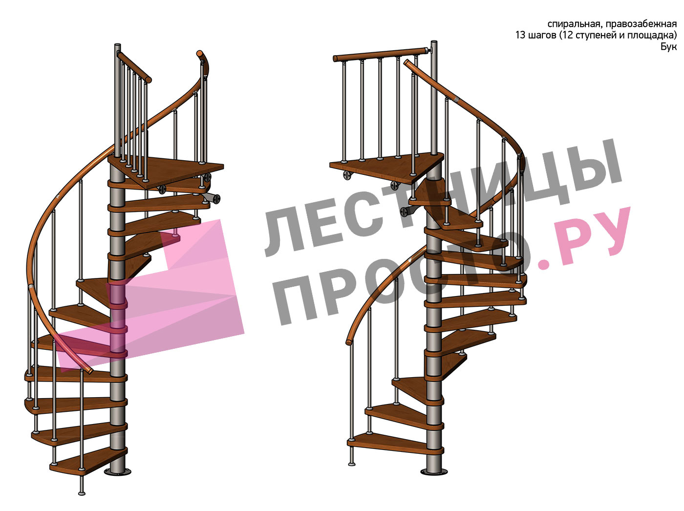 Решение о направлении поворота принимается при сборке лестницы - универсальная конструкция позволяет собрать правозабежную и левозабежную лестницы. Ширина ступени между центральной колонной и поручнем ≈ 680 мм