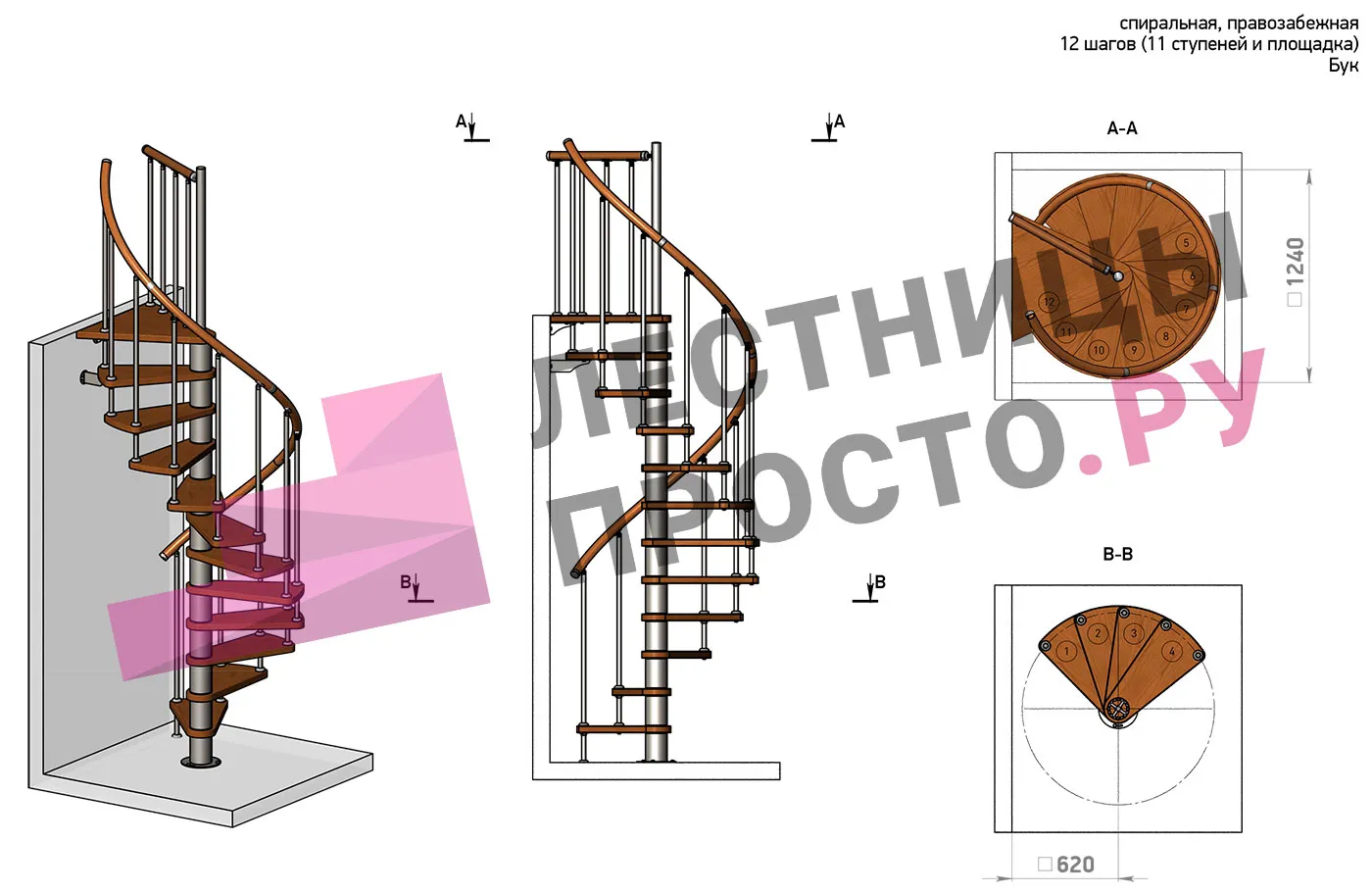 Решение о направлении поворота принимается при сборке - универсальная конструкция позволяет собрать правозабежную и левозабежную лестницы. Высота ступеней регулируется с шагом 3 мм. в пределах 217-247 мм., благодаря чему, лестница прекрасно подгоняется под необходимую высоту.