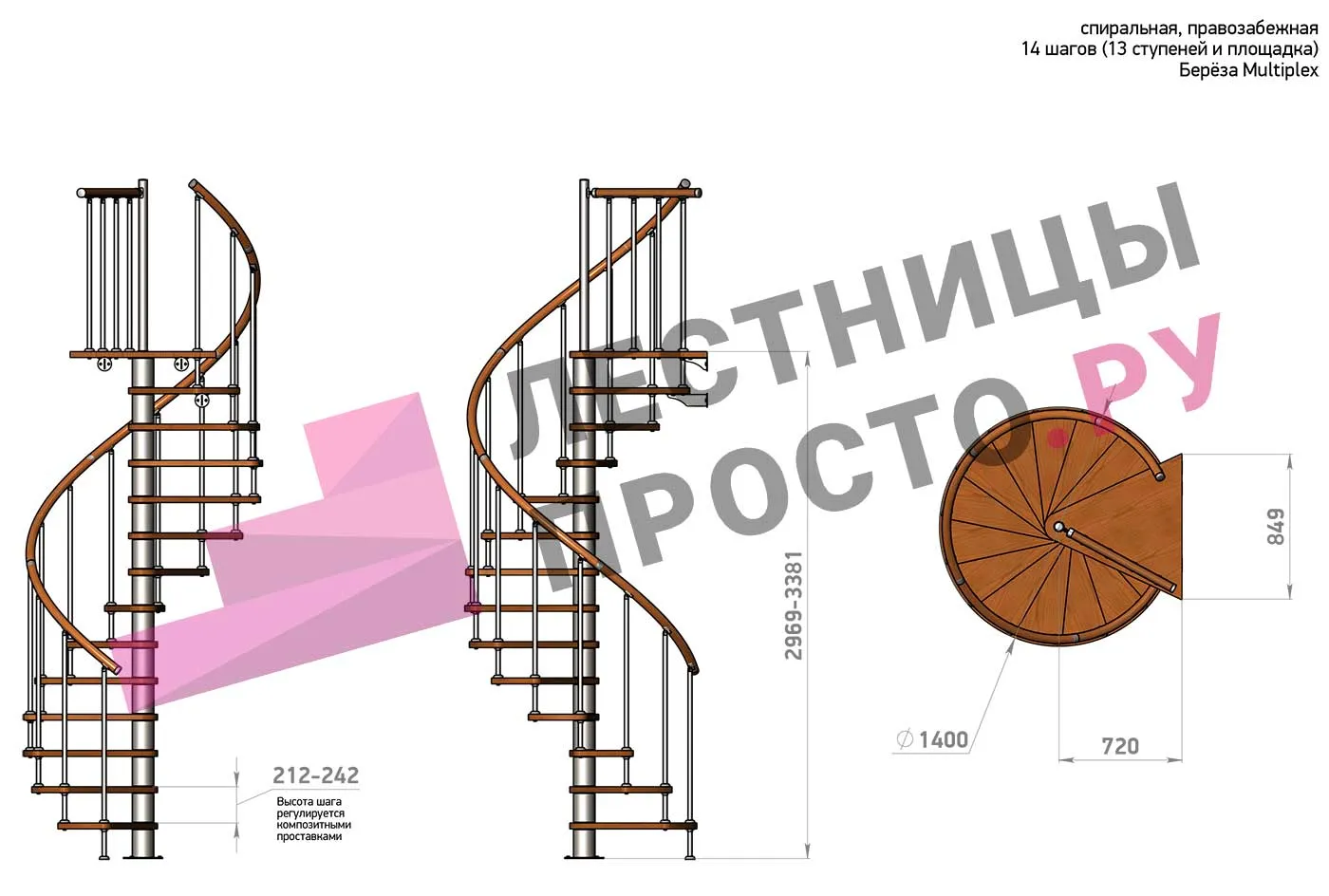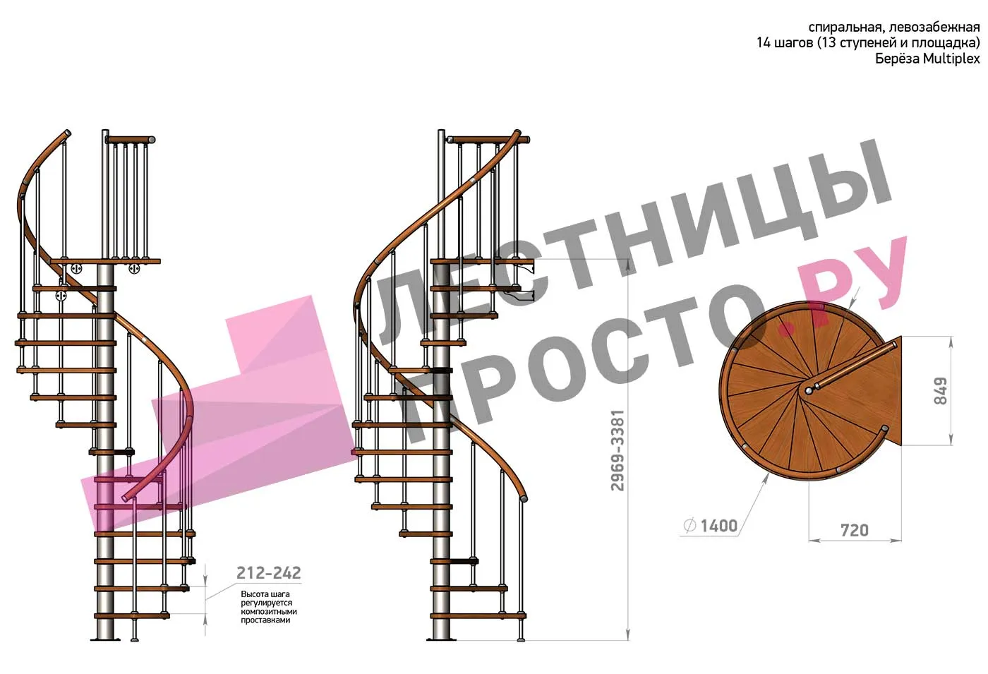 Высота ступеней регулируется с шагом 3 мм. в пределах 210-231 мм., благодаря чему, лестница прекрасно подгоняется под необходимую высоту.