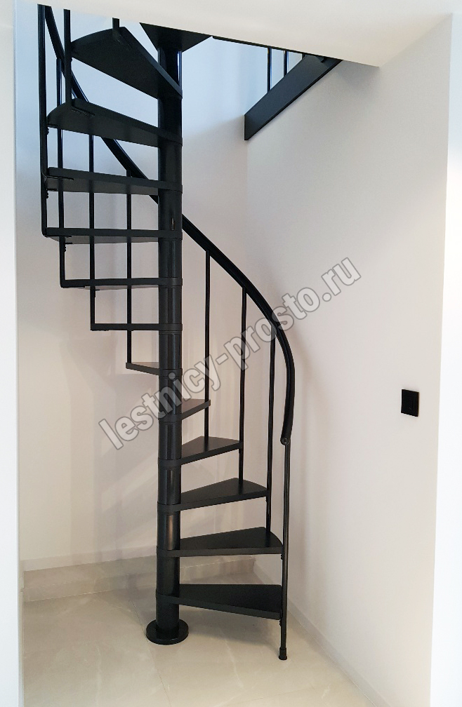 Ступени лестницы изготовлены из бука по технологии MULTIPLEX и покрыты износостойким защитным лаком. Лестница монтируется как по часовой стрелке, так и против. Возможен монтаж в круглый или квадратный проём. Ограждение: стальные трубки, Ø25 мм RAL 7016. Поручень: гибкий цельный ПВХ-поручень Ø40 мм антрацитового цвета. Конструкция и балюстрада окрашены порошковым способом в антрацитовый цвет (RAL 7016).